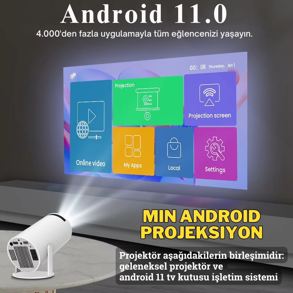 Mini Taşınabilir Projeksiyon Cihazı, HD kalitede görüntü ve ses deneyimi sunar. Android 11 ile tam uyumlu olan bu cihaz, TV projeksiyon özelliği ile evde, ofiste veya dışarıda kolayca kullanılabilir. Taşınabilir ve pratik tasarımıyla her yerde eğlence ve iş için ideal bir çözüm sunar.
